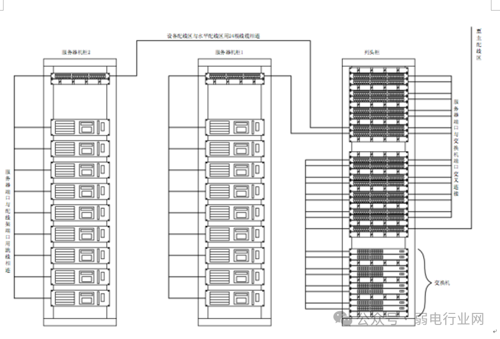 5、机房布线工程综合布线系统的电缆敷设贯穿在整个机房,整理设计原则是具有兼容性、灵活性、模块性、可扩充性、经济性。数据中心采用网络列头柜模式,按机柜列或者系统部署网络安全分区防护的策略,减少设备柜到综合布线柜之间线缆长度,做到灵活的部署设备,包括:(1)单柜配置一条24芯光纤,24条网线;(2)单柜配置一条24口铜缆配线架汇聚于综合布线柜,两个模块间配置2条铜缆配线架互联;(3)网络配线架及光纤配线架配置理线器;如图所示:
